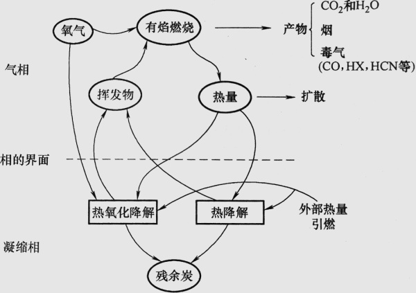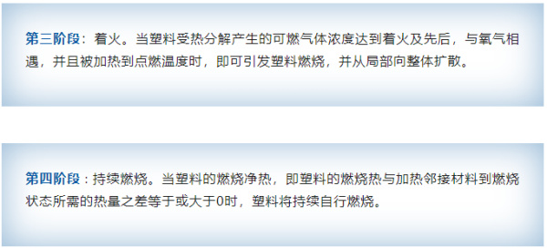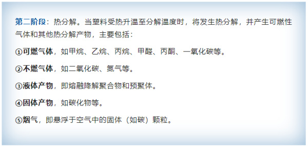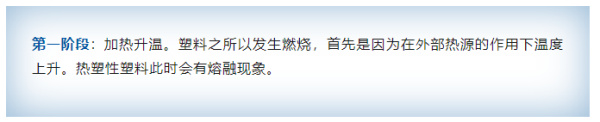 塑料的燃燒過程是一個非常激烈復雜的熱氧化反應,具有冒濃煙或熾烈火焰的特征。塑料燃燒的一般過程可分為5個基本階段。
