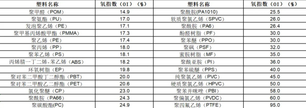 能維持聚合物燃燒的混合氣體中氧氣的小體積分數,稱為聚合物的極限氧指數(LOI),簡稱氧指數(OI)。氧指數是衡量聚合物材料是否燃燒的重要指標。由于空氣中氧氣的體積分數為20.9%,所以,氧指數小于21%的聚合物,一般可在空氣中被點燃。